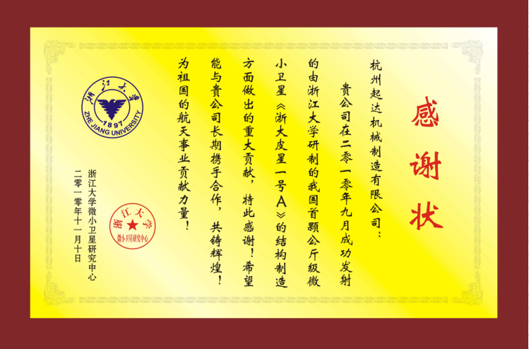 浙江大學(xué)微小衛(wèi)星中心為我公司頒發(fā) “皮星一號” 感謝狀