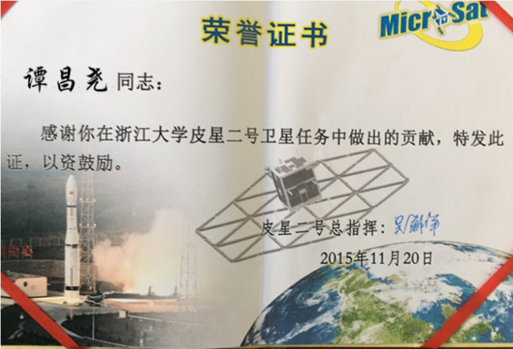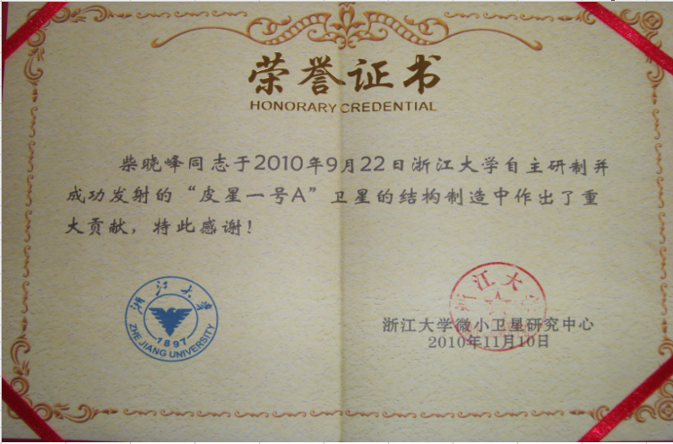 浙江大學(xué)微小衛(wèi)星中心為我柴總頒發(fā) “皮星一號” 榮譽證書