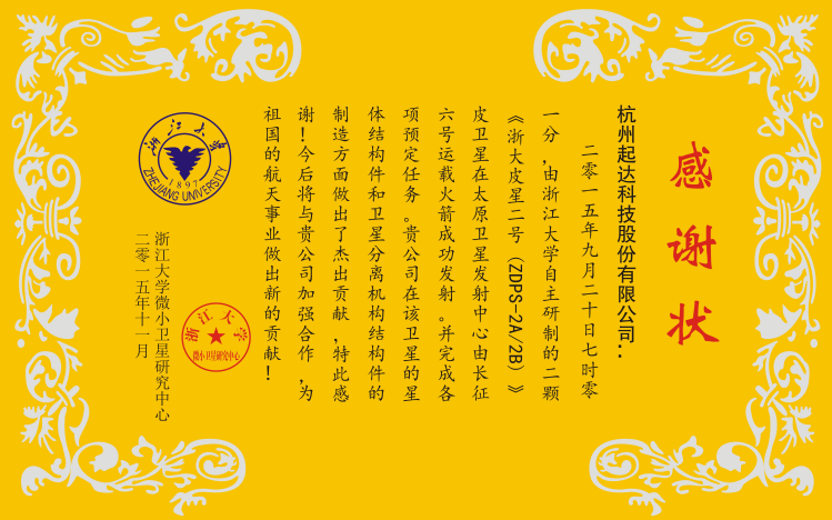 浙江大學(xué)微小衛(wèi)星中心為我公司頒發(fā) “皮星二號” 感謝狀